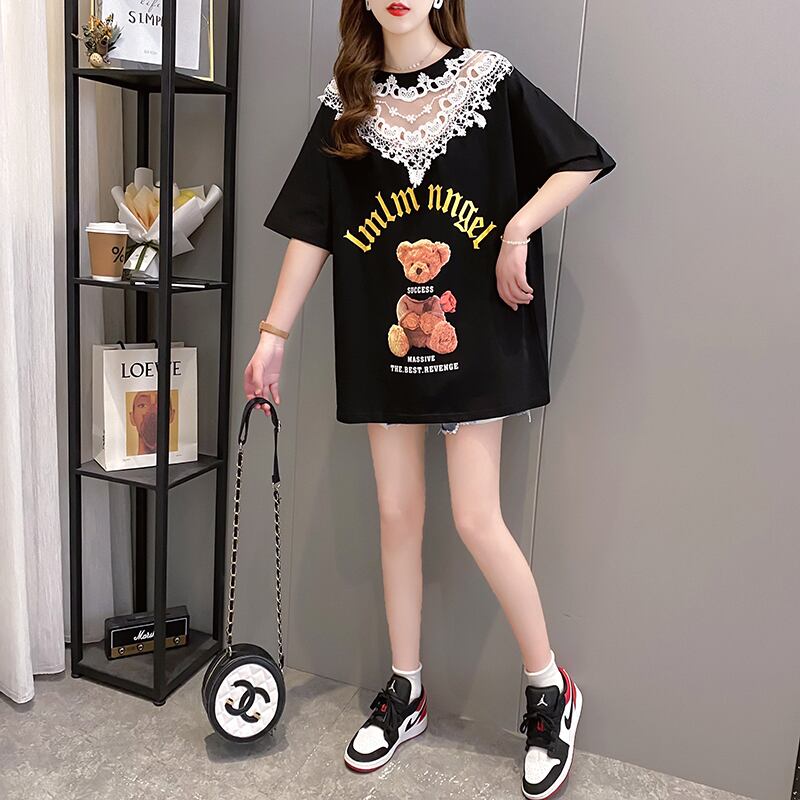 クマちゃんと首周りのレースが可愛い半袖トップスです。
